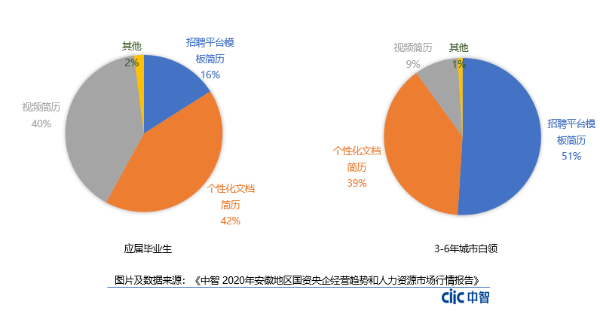 數(shù)據(jù)顯示,42%的2020應(yīng)屆生求職會(huì)選擇個(gè)性化的文檔簡(jiǎn)歷呈現(xiàn)給HR,40%的應(yīng)屆生求職選擇視頻簡(jiǎn)歷更直接的展示自己的優(yōu)勢(shì)。相比之下,較傳統(tǒng)的招聘平臺(tái)模板簡(jiǎn)歷,只有16%的應(yīng)屆生求職時(shí)選擇使用。另一項(xiàng)數(shù)據(jù)顯示,3-6年的城市白領(lǐng)求職者簡(jiǎn)歷呈現(xiàn)方式選擇傳統(tǒng)的招聘平臺(tái)模板簡(jiǎn)歷,選擇視頻簡(jiǎn)歷呈現(xiàn)的比例僅為9%。